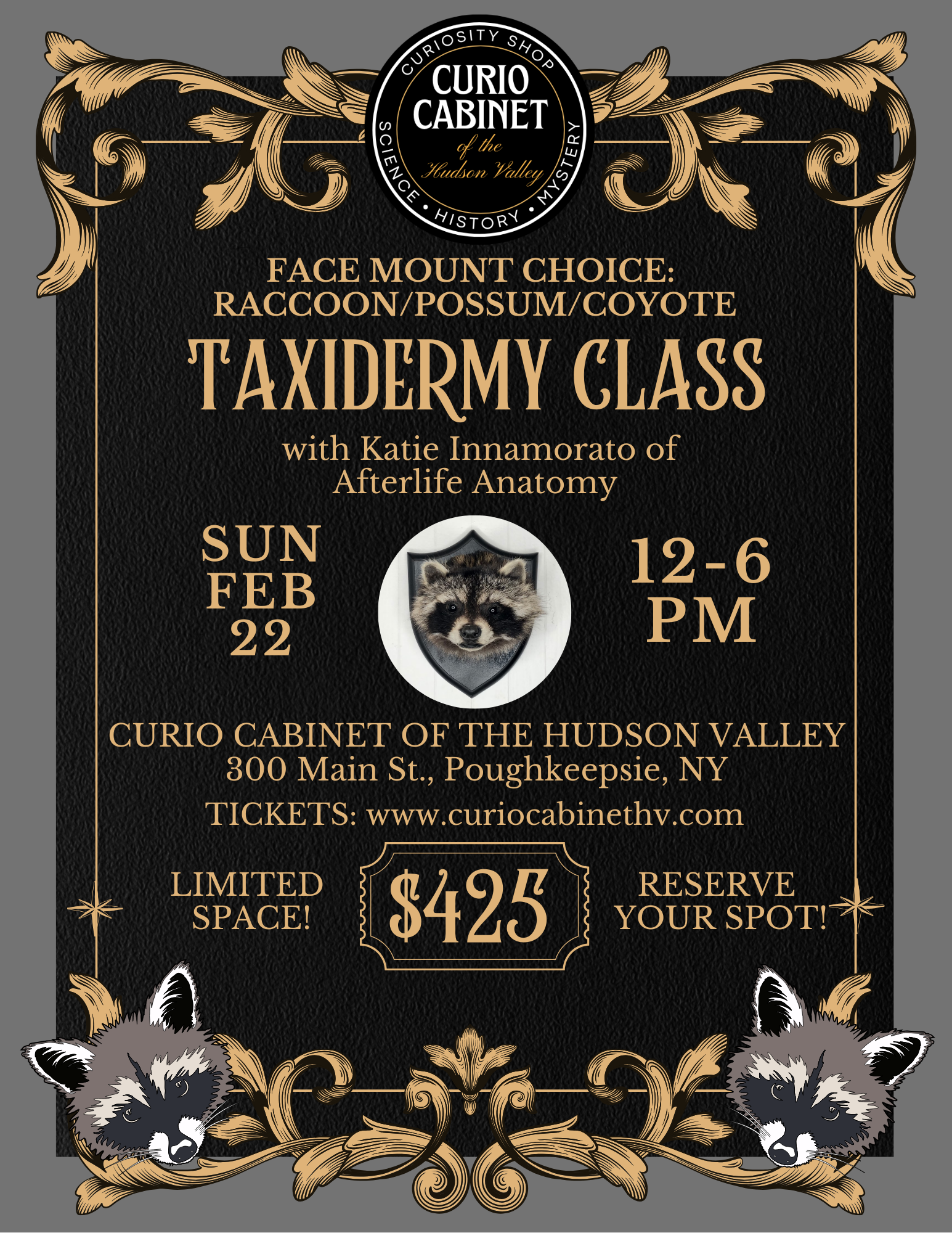 Artists' choice! This class will introduce students to the basics of larger mammals. Each student is provided with a skinned, tanned, and prepped skin for mounting. Selections include raccoon, possum, or coyote. A skinning demonstration will be done (you will not be skinning individual pieces due to time) and we will discuss tanning, fleshing, splitting/turning, etc. We will go through proper form prep and do final touches on our skins prior to mounting. Finally we will do our clay work, mount, pin, and dry our mounts. Everyone goes home with their own piece!